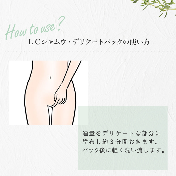 そんな時には、デイリーケアとして『LCジャムウ・デリケートパック』でおりものを洗い流して、臭いの元をケア&デリケートゾーンの肌の引き締めケアをしていきましょう。